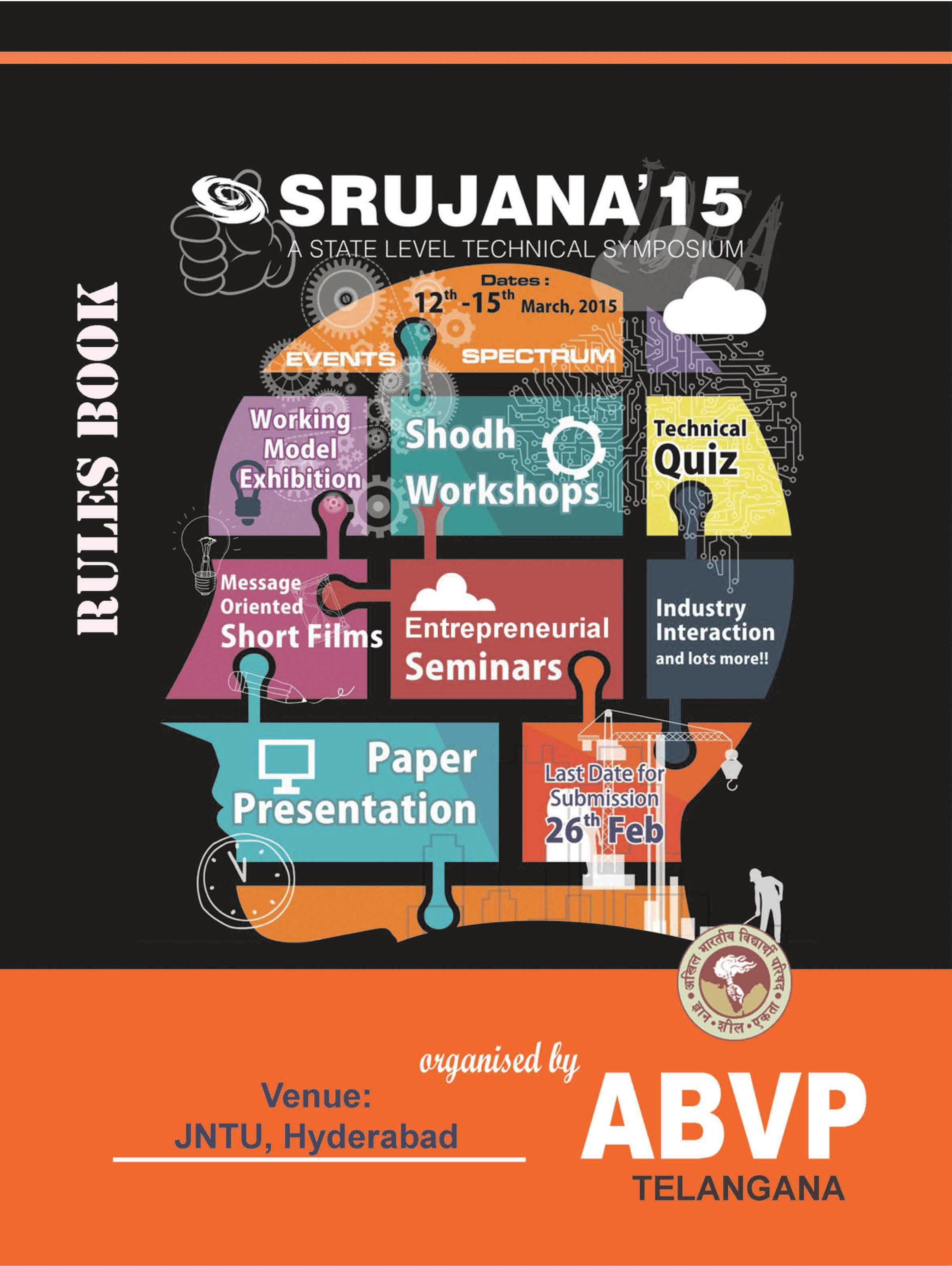 Start Date Thu, 03/12/2015 - 10:00 Srujana' 15 is a state level Technical Symposium organised by Telangana Unit of ABVP. Find the registration form and rule book below. You can download and send it to us. File Attachment Entry Form.pdf70.09 KB Rules Book_Final.pdf114.14 KB